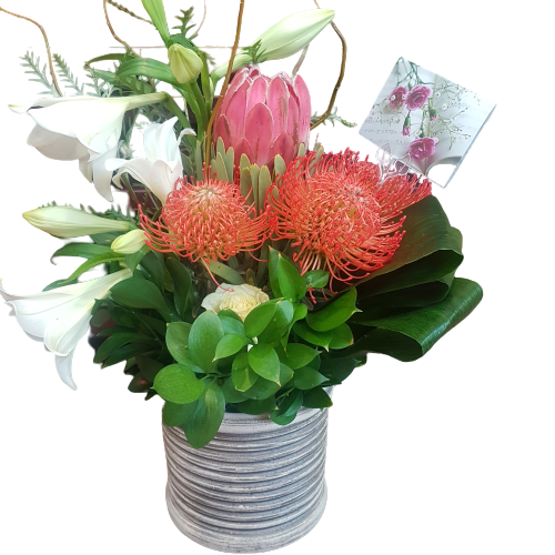 Clay vase with a rustic selection of Pin Cushion and Protea