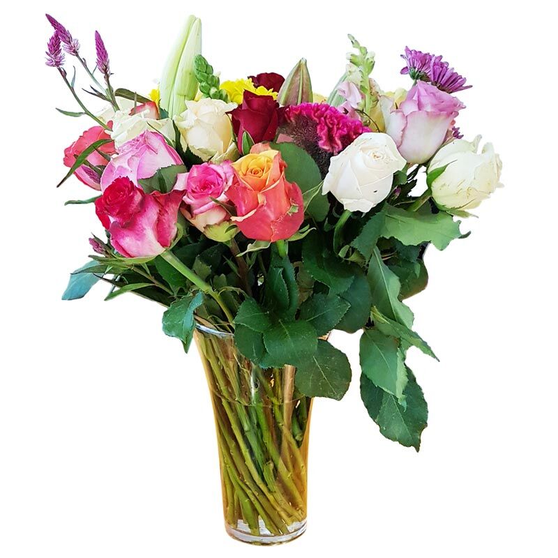 A colorful and vibrant bouquet, perfect for hearty relations. Tall long-stemmed pink carnations mixed Vase Arrangement with lighter pink sprays that blend well into orange lilies which combine to make a stunning bouquet delivered in a glass vase. This bouquet is perfect for all occasions. Please note Lilies may arrive in the bud for extra freshness and life.
