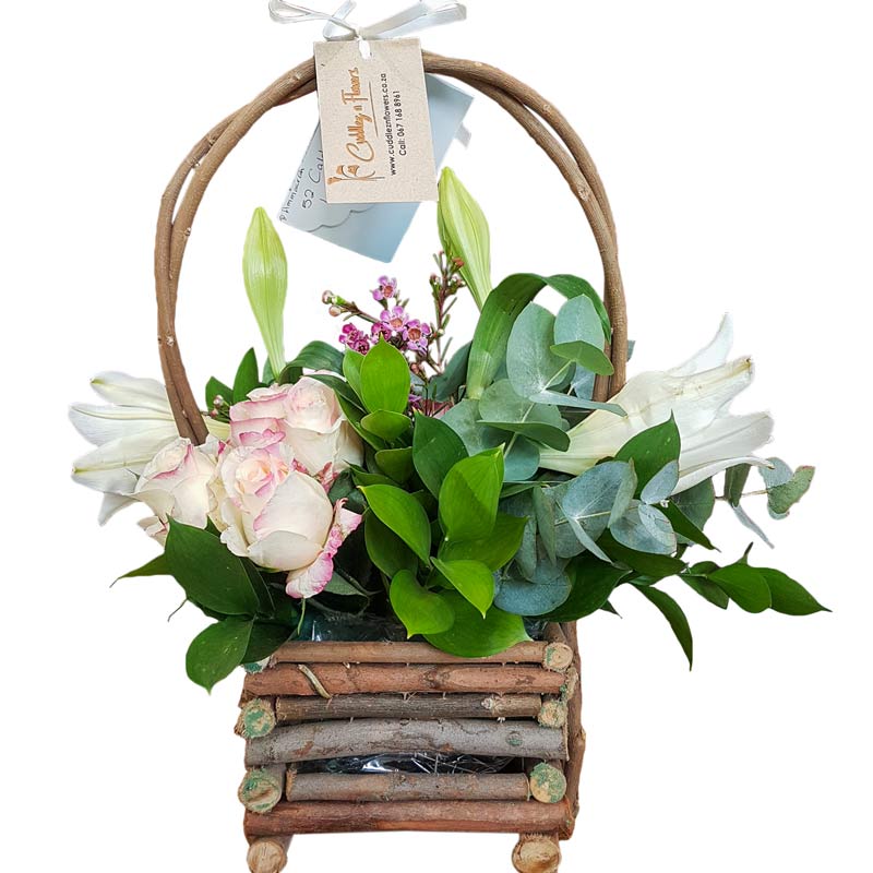 Looking for a gift that’s both rustic and elegant? Our crafty twig basket arrangement, featuring a stunning mix of roses, lilies, and lush greenery, is perfect for any occasion! This charming arrangement brings together the natural beauty of roses and lilies with the rustic charm of a handwoven twig basket.