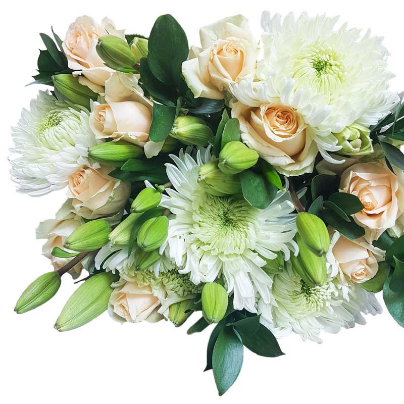 The soft and luxurious pearl roses add a touch of elegance and charm, while the white lilies bring an air of purity and sophistication. The delicate white stem sprays provide a subtle yet beautiful complement, and the rich green ruscus adds depth and texture to the bouquet. Each flower is meticulously selected for its quality and freshness, ensuring a stunning and lasting display.